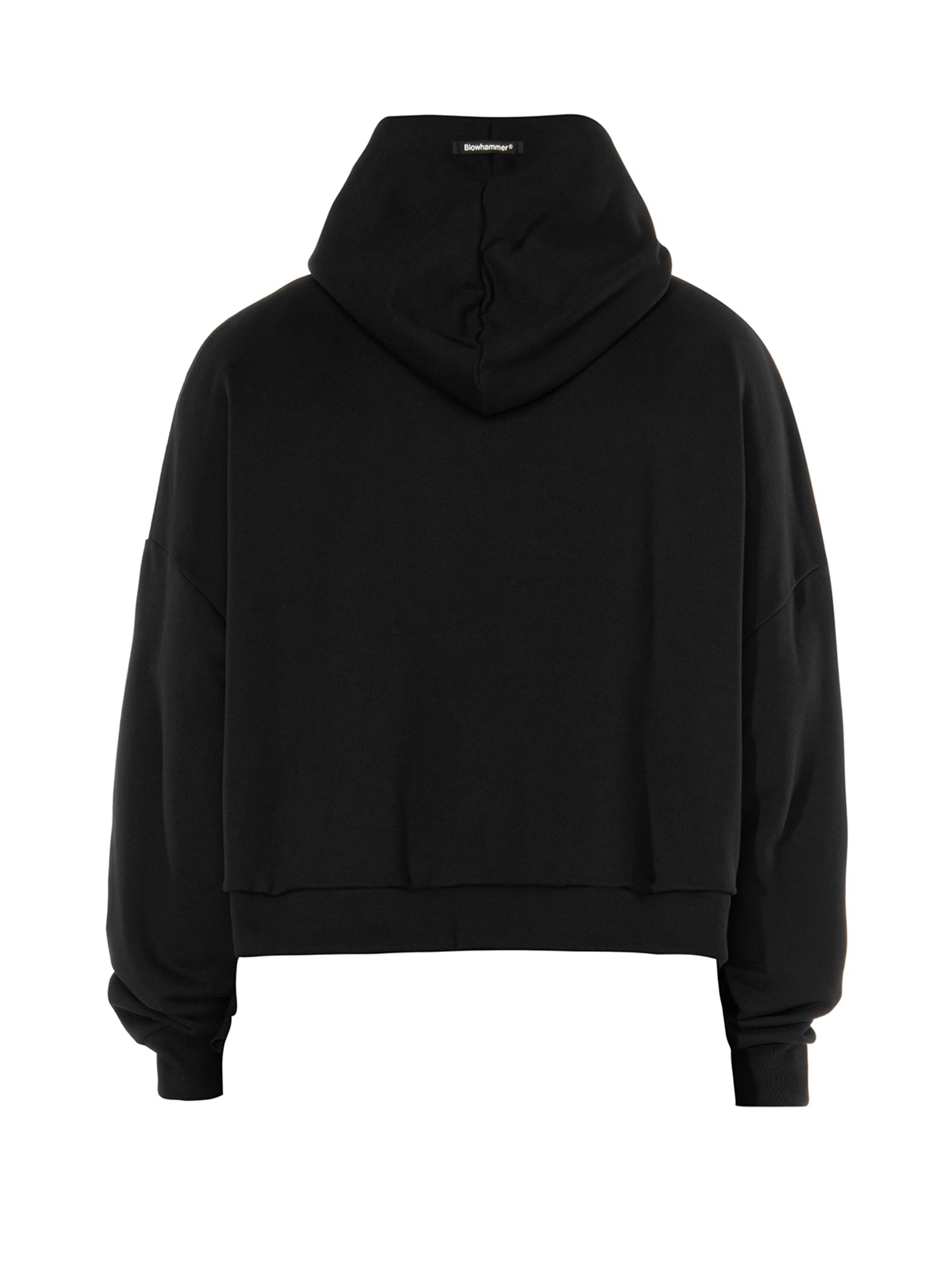 Trechterhals, lange mouwen, verborgen clipsluiting aan de voorkant, twee zijzakken met onzichtbare ritssluiting. Digitale print "B&H". Label toegepast.