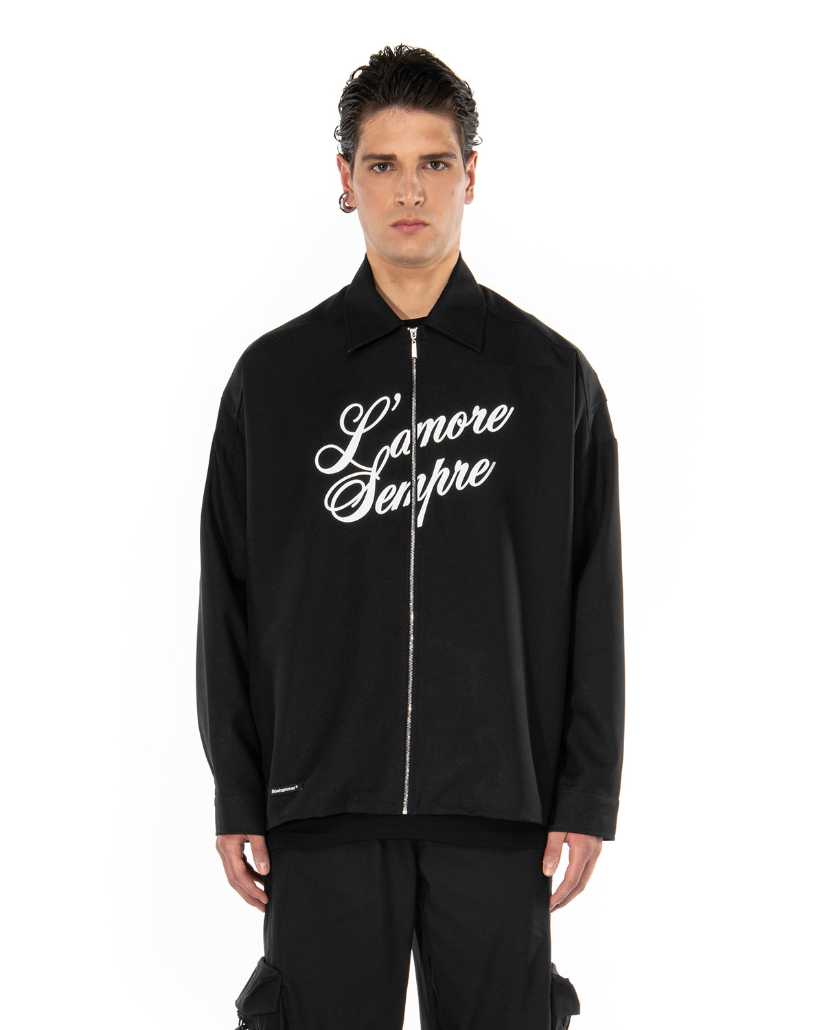 Overhemdkraag en mouwen. Centrale ritssluiting. Digitale print: "Liefde altijd". Etiket toegepast.