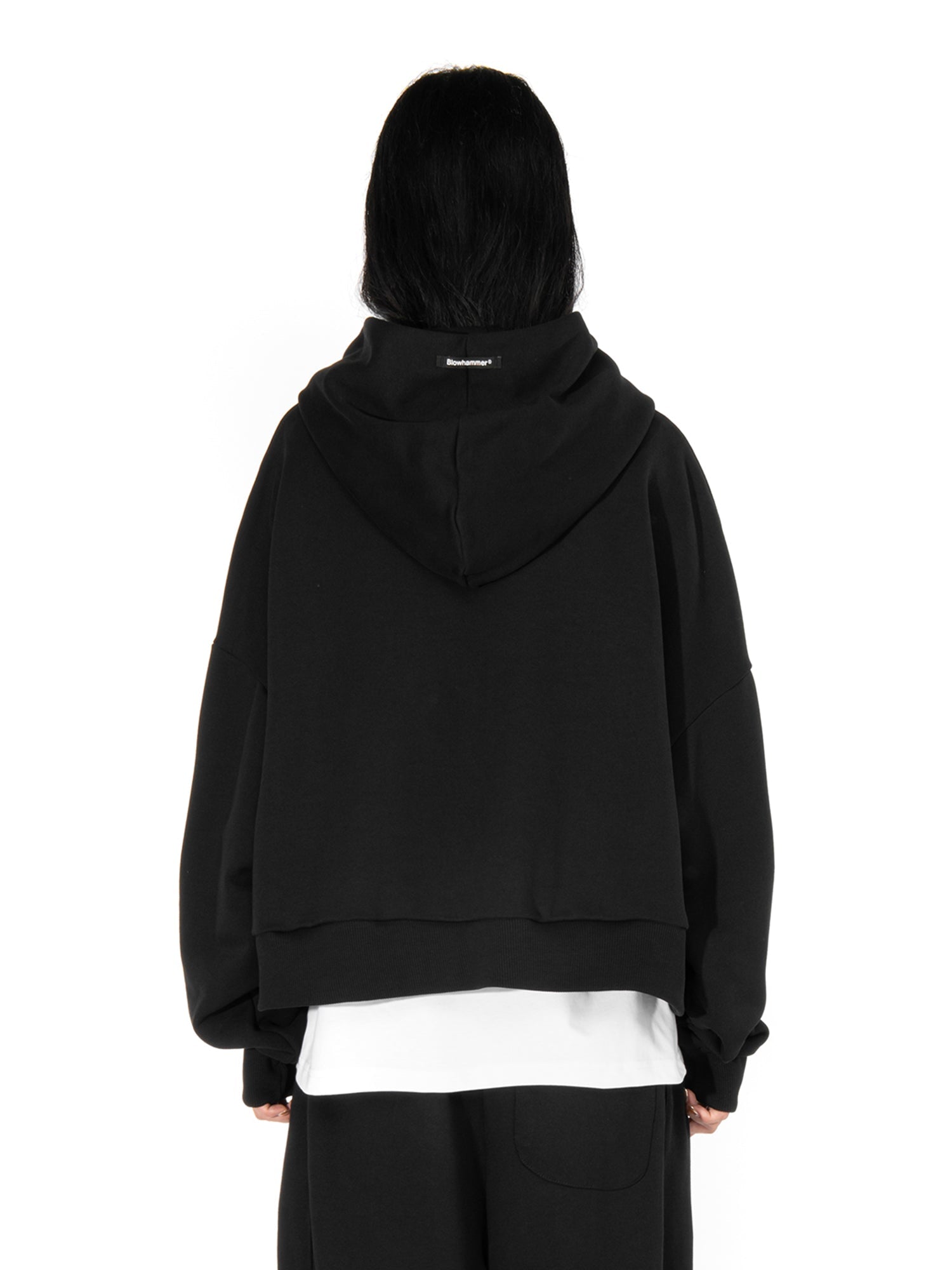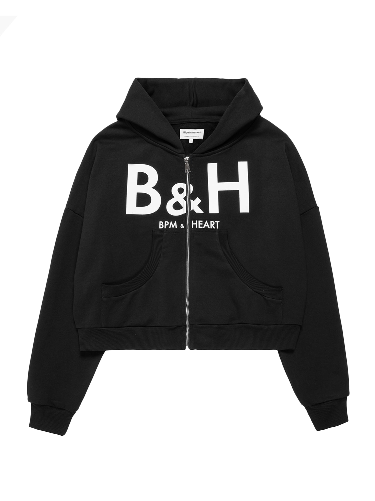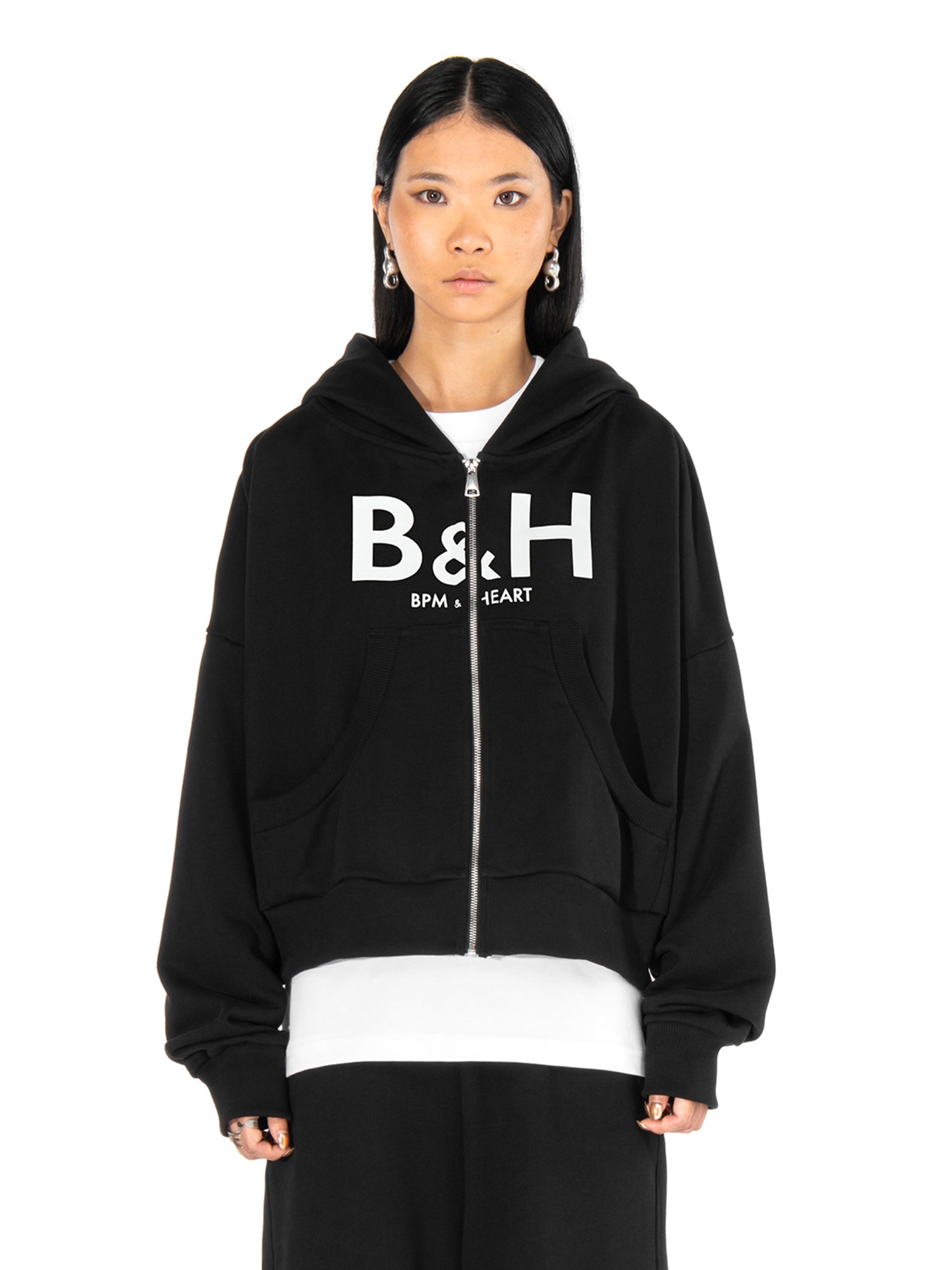Trechterhals, lange mouwen, verborgen clipsluiting aan de voorkant, twee zijzakken met onzichtbare ritssluiting. Digitale print "B&H". Label toegepast.