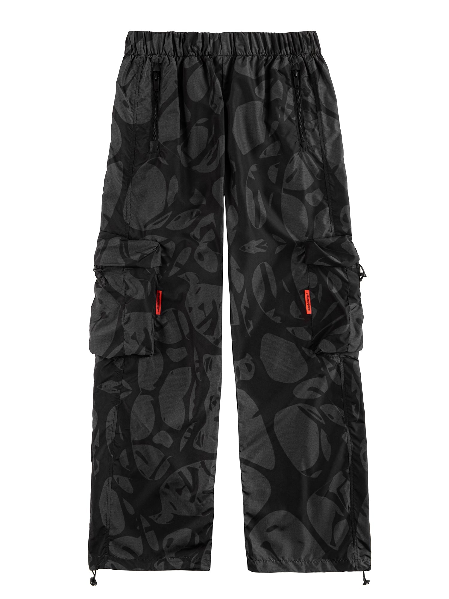 Verstelbare elastische tailleband. Zijzakken met rits. Zakken op de benen met stopper. Verstelbare enkelboorden. Sublimatieprint en aangebracht gevouwen label.